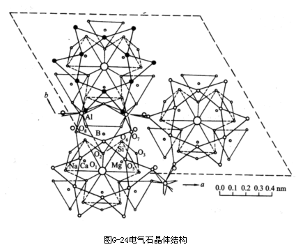 【晶體結(jié)構(gòu)】三方晶系; -R3m;a0=1.584~1.603 nm,c0=0.709~0.722 nm;Z=3。電氣石晶體結(jié)構(gòu)基本特點(diǎn)為[SiO4]四面體組成復(fù)三方環(huán)。B配位數(shù)為3,組成平面三角形;Mg配位數(shù)為6(其中有兩個(gè)是OH-),組成八面體,與[BO3]共氧相連。在[SiO4]四面體的復(fù)三方環(huán)上方的空隙中有配位數(shù)為9的一價(jià)陽離子Na+分布。之間以[AlO5(OH)]八面體相聯(lián)結(jié)(圖G-24)。