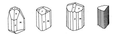 三方柱:m{01 0};六方柱:a{11 0};三方單錐:r{10 1},o{02 1};復(fù)三方單錐:u{32 1}